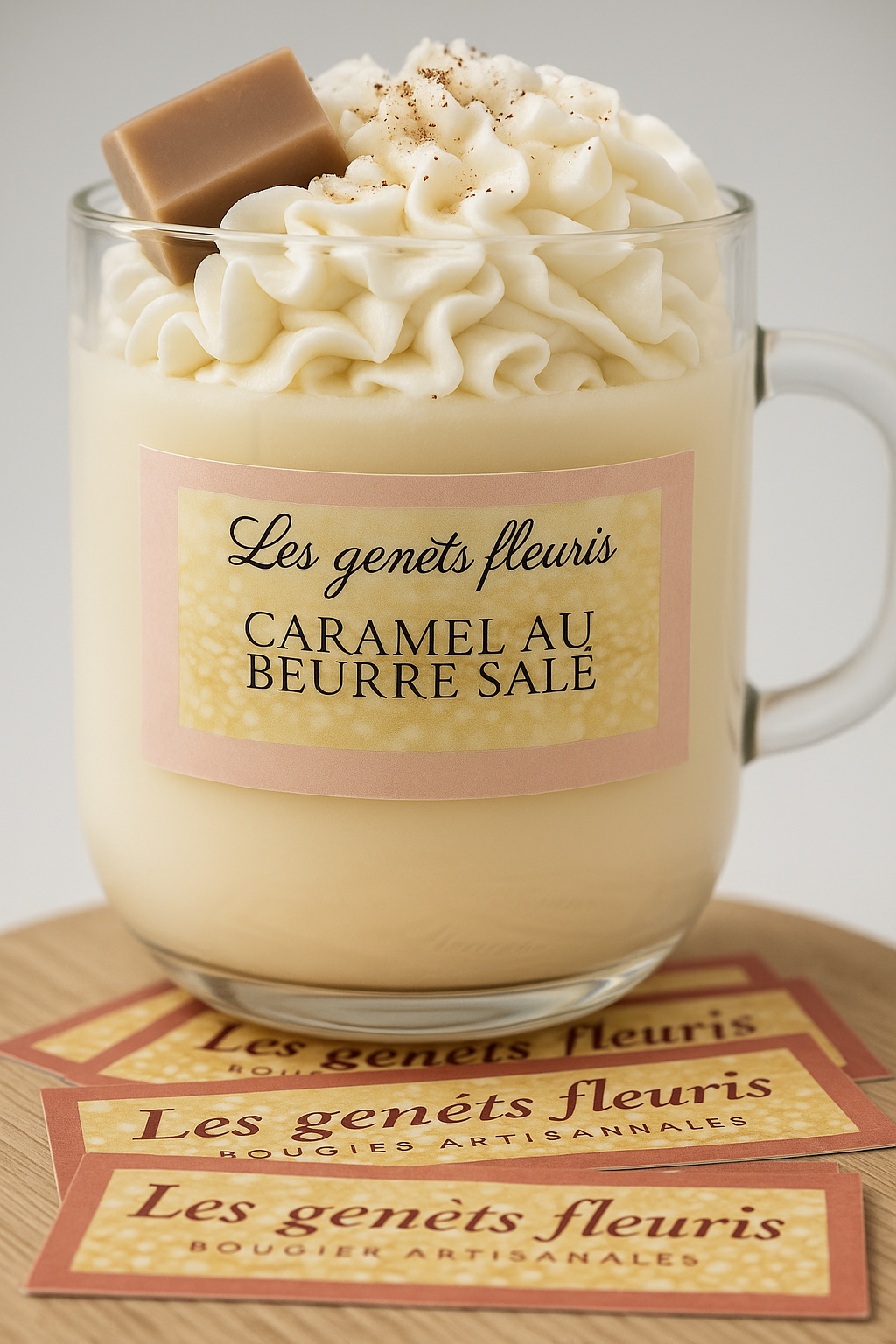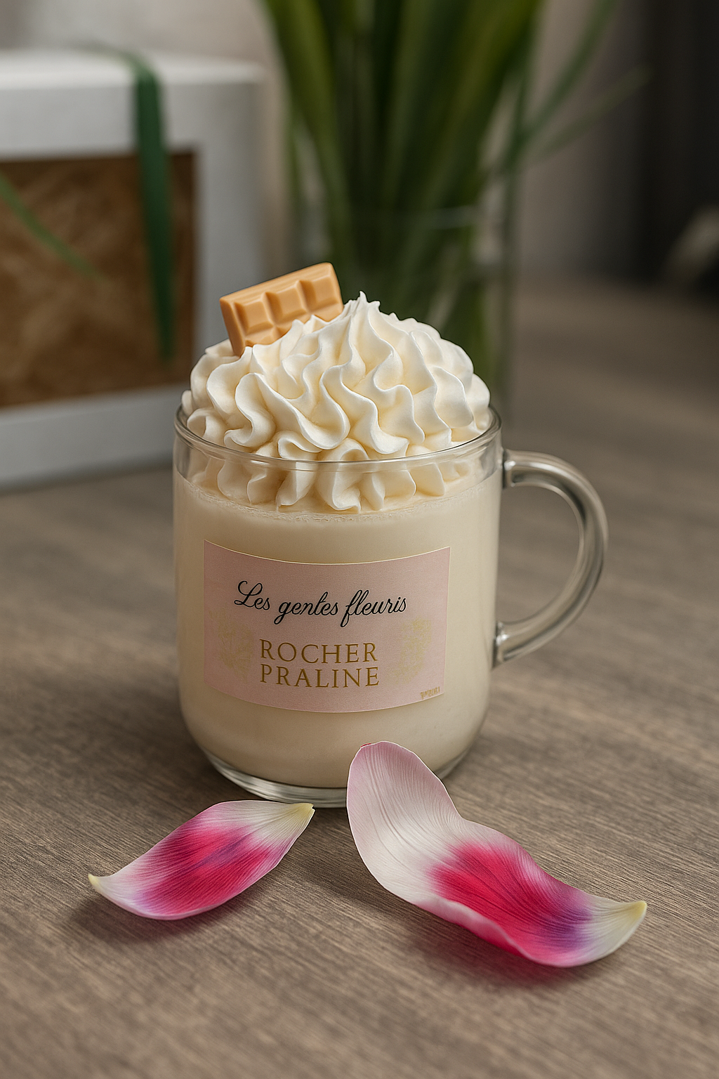 Cette bougie est réalisée de façon artisanale, coulée à la main avec de la cire de soja. La chantilly est fouettée, ensuite travaillée avec une poche à douille. On y ajoute du parfum venant directement de la ville de Grasse (France), bien connue pour sa production de parfums. Celui-ci est sans substance toxique et cancérigène et respecte les normes IFRA et CLP CE N°1907/200.